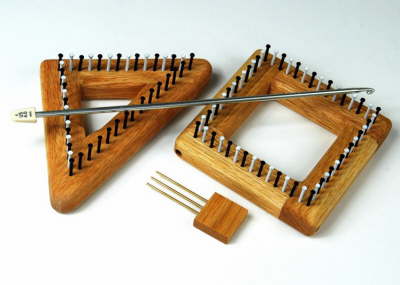 Woods: Available in oak Contents: 1 each of Hazel Rose 3½ inch Triangular & Square Quilt Weaver Looms 1 Packing fork 1 Crochet hook (2 looms, crochet hook and packing fork shown in photo above) Booklet of instructions