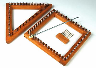 Woods: Available in cherry and oak Contents: 1 each of Hazel Rose 7 inch (18 cm) Triangular & Square Quilt Weaver Looms 1 Packing fork 1 Crochet hook (2 looms, crochet hook and packing fork shown in photo above) Booklet of instructions