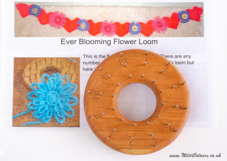 This loom is made of wood and it is 10 cm in diameter with three rows of 12 pins. This allows you to make flowers with three sets of petals up to 8 cm in diameter. You can create a large number of different flowers using this loom by using different types of yarns and by using different colours for each set of petals.